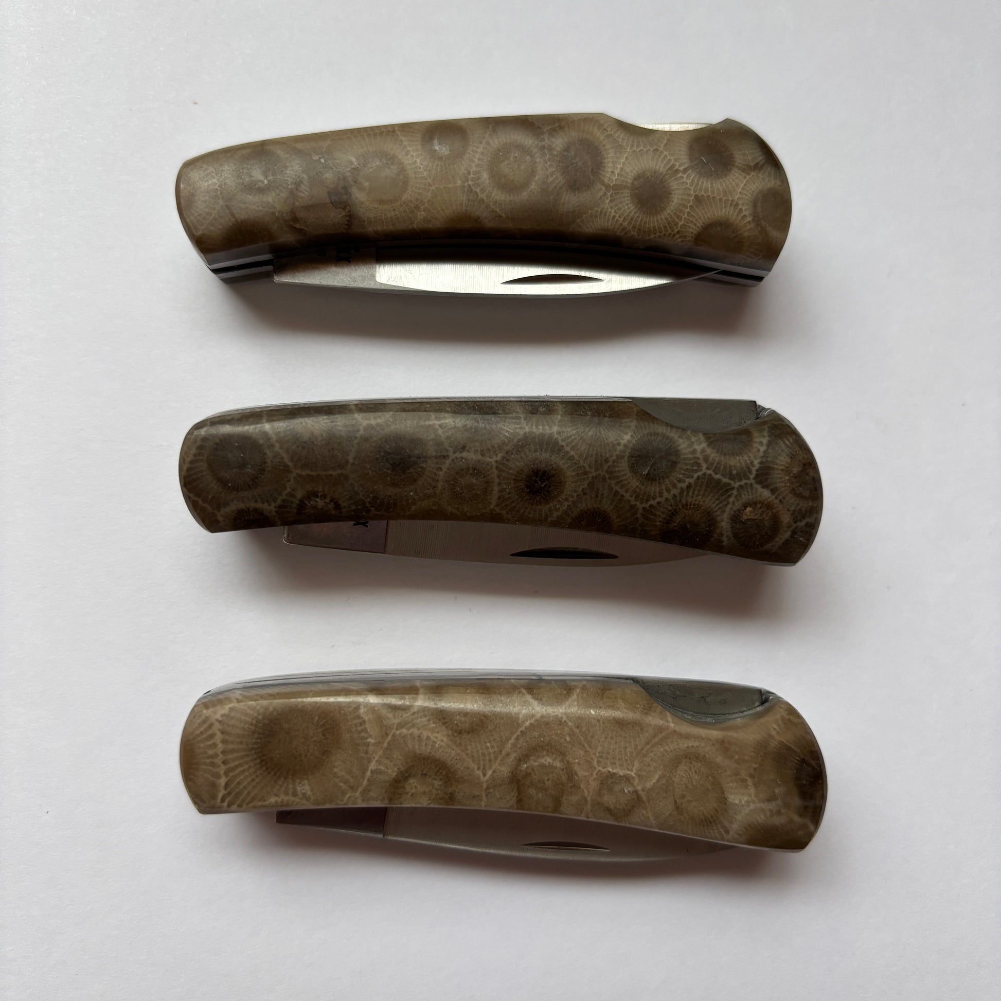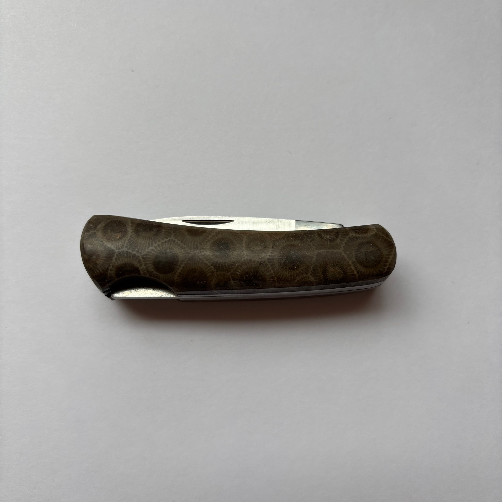 Elevate your collection with this 2-inch pocket knife featuring a stainless steel blade. The handle showcases a unique Petoskey stone inlay, blending natural elegance with expert craftsmanship. This refined piece offers both exceptional cutting performance and a sophisticated aesthetic, perfect for those who appreciate the union of art and utility. Made in USA