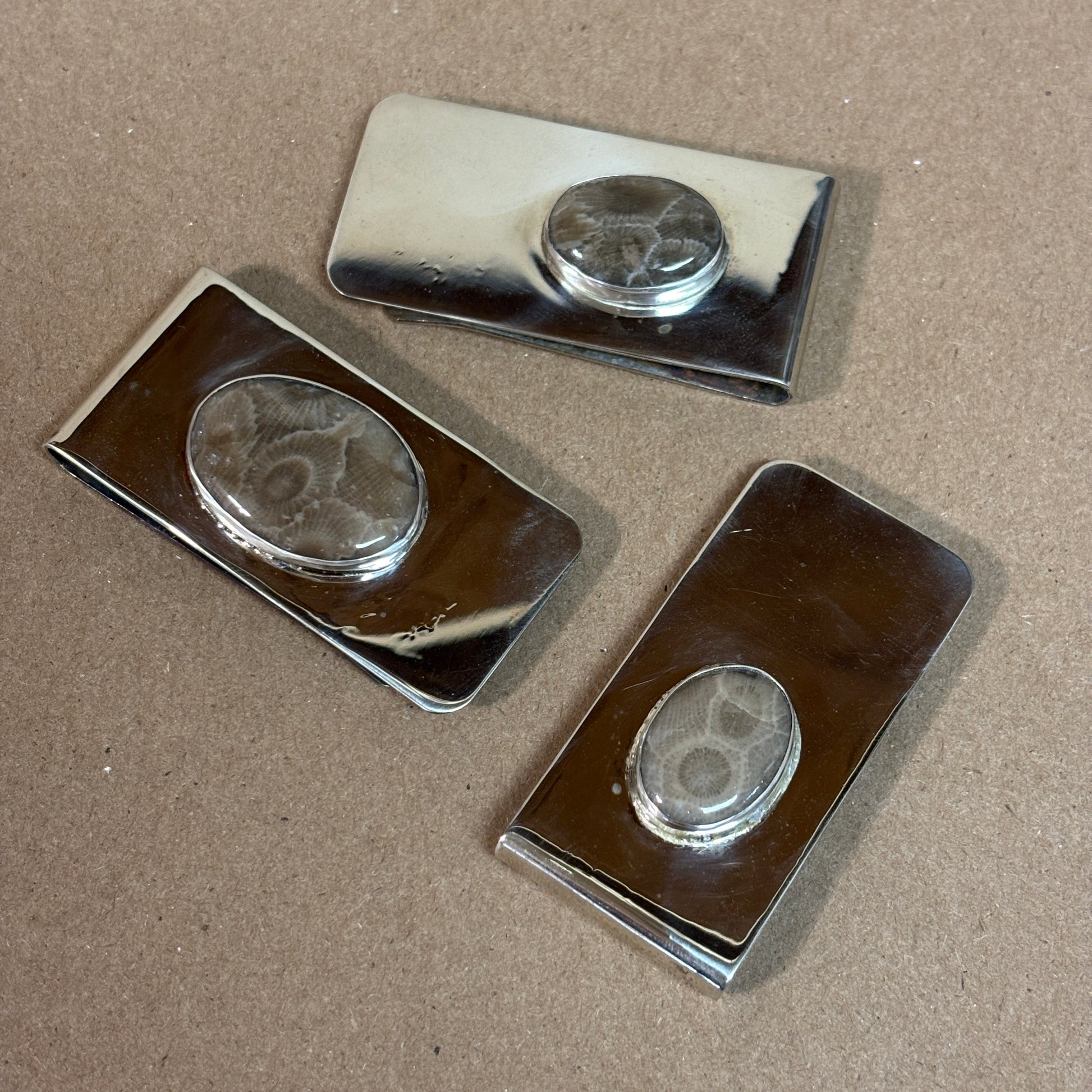 This refined money clip combines practical elegance with geological intrigue. Crafted in sterling silver with a substantial, polished design, it features an oval Petoskey stone—a 350-million-year-old fossilized coral native to Michigan. The bezel setting showcases the stone's distinctive honeycomb pattern while the wide clip ensures secure, reliable performance. A sophisticated accessory for those who appreciate timeless craftsmanship and natural beauty.