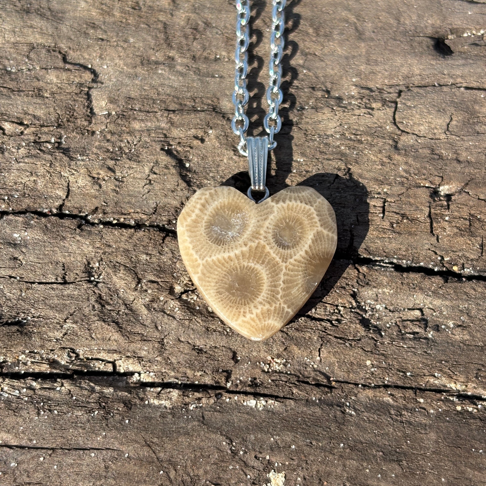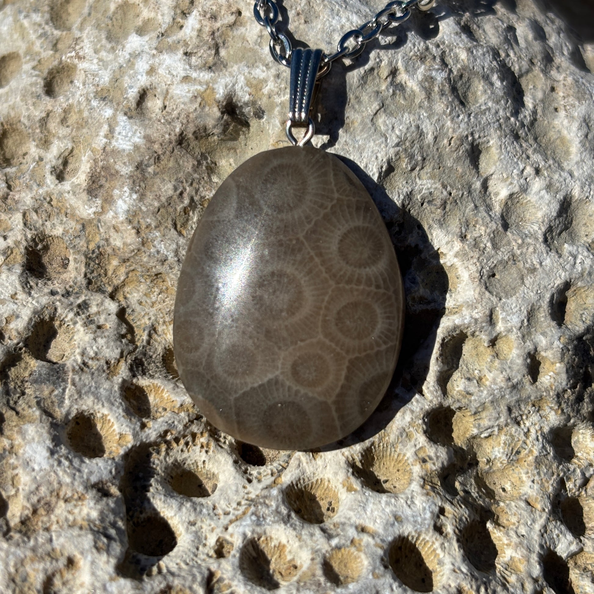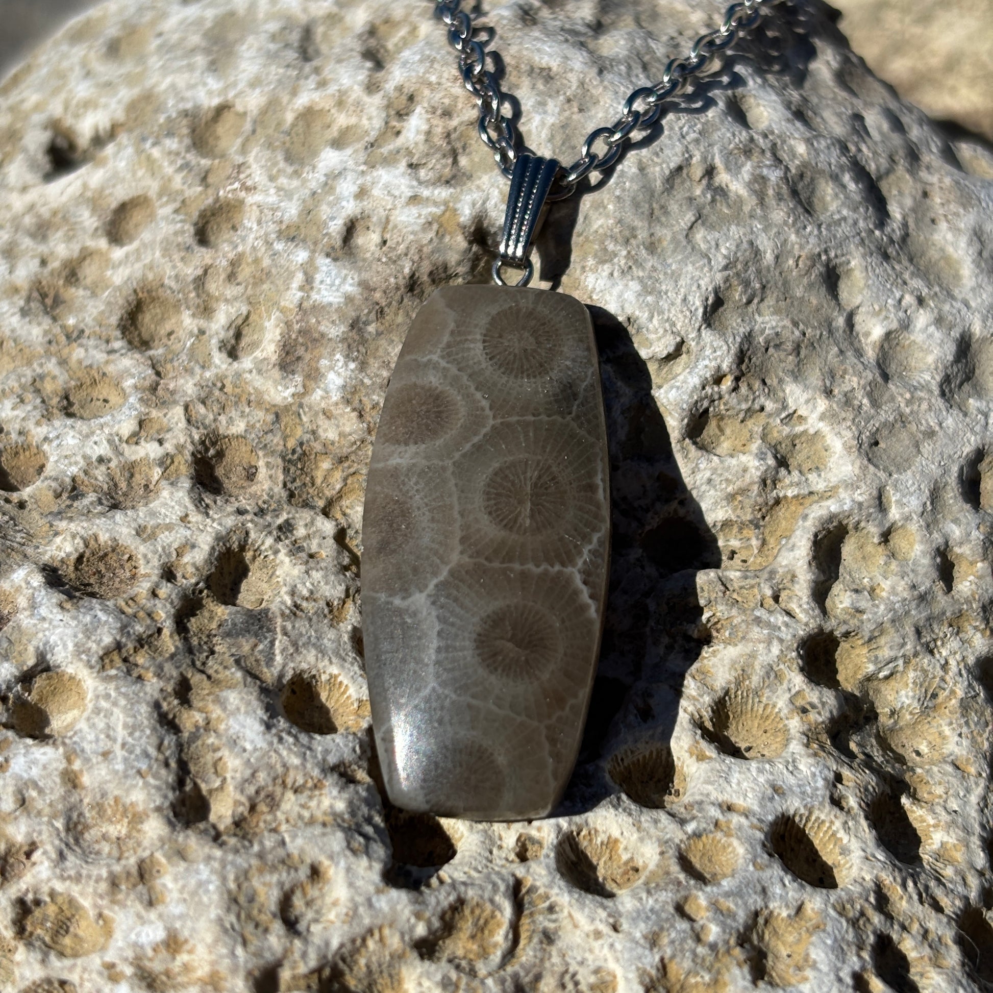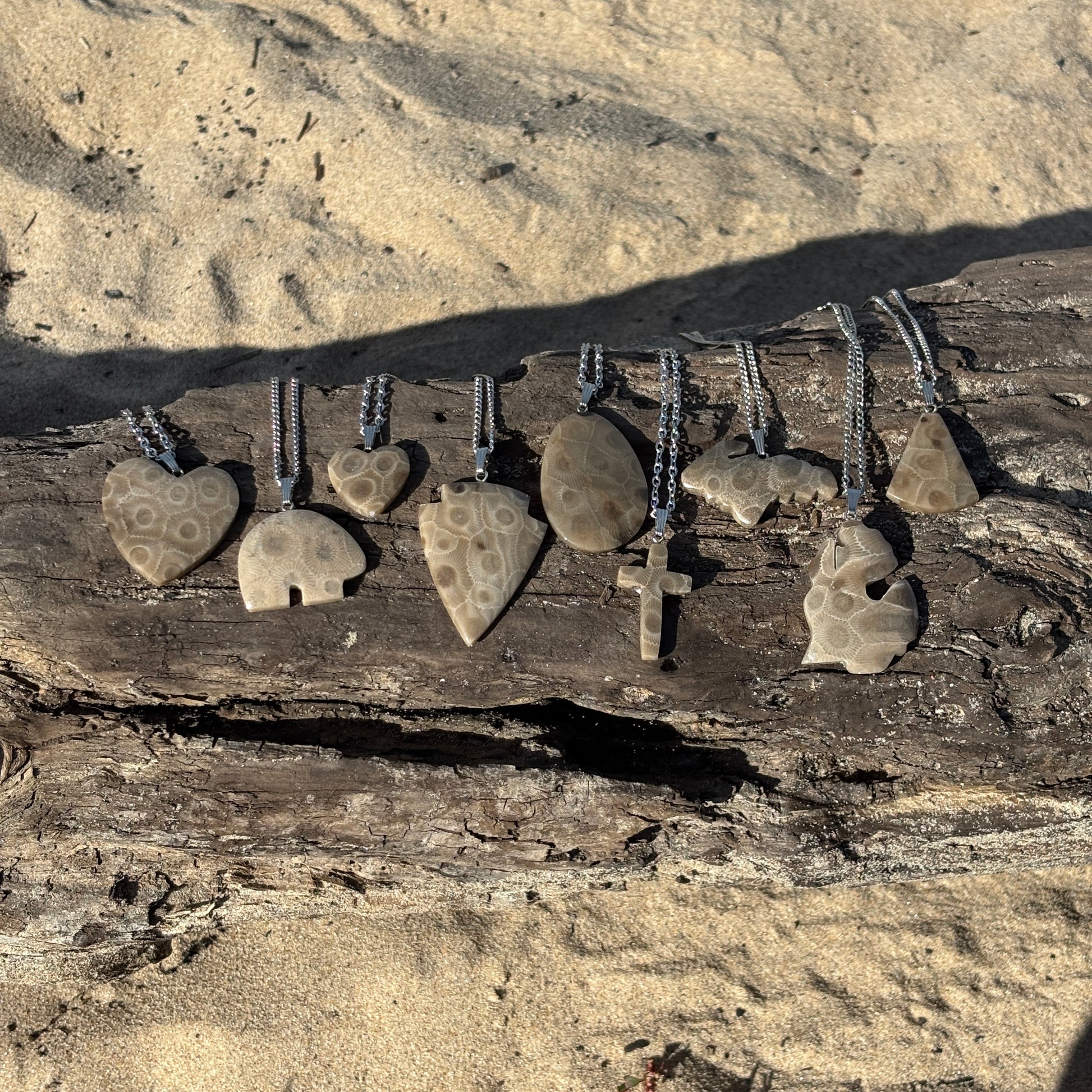Embrace the playful spirit of nature with our Petoskey Stone Necklaces! Each necklace showcases a hand-polished and shaped Petoskey stone.These shapes make every piece a fun, wearable conversation starter that brightens your style with a touch of Michigan’s historic state stone. Perfect for adding a bit of whimsy to your day!