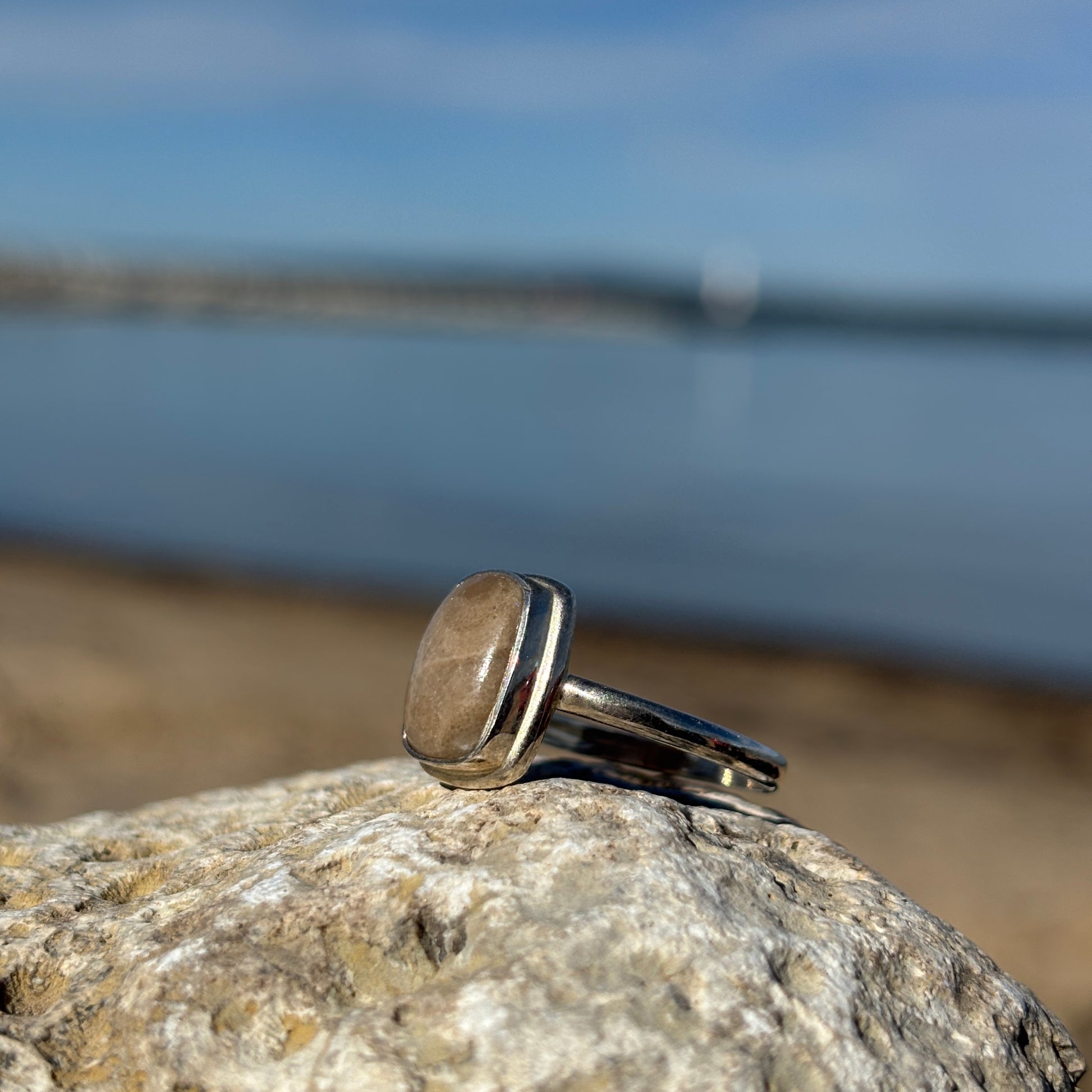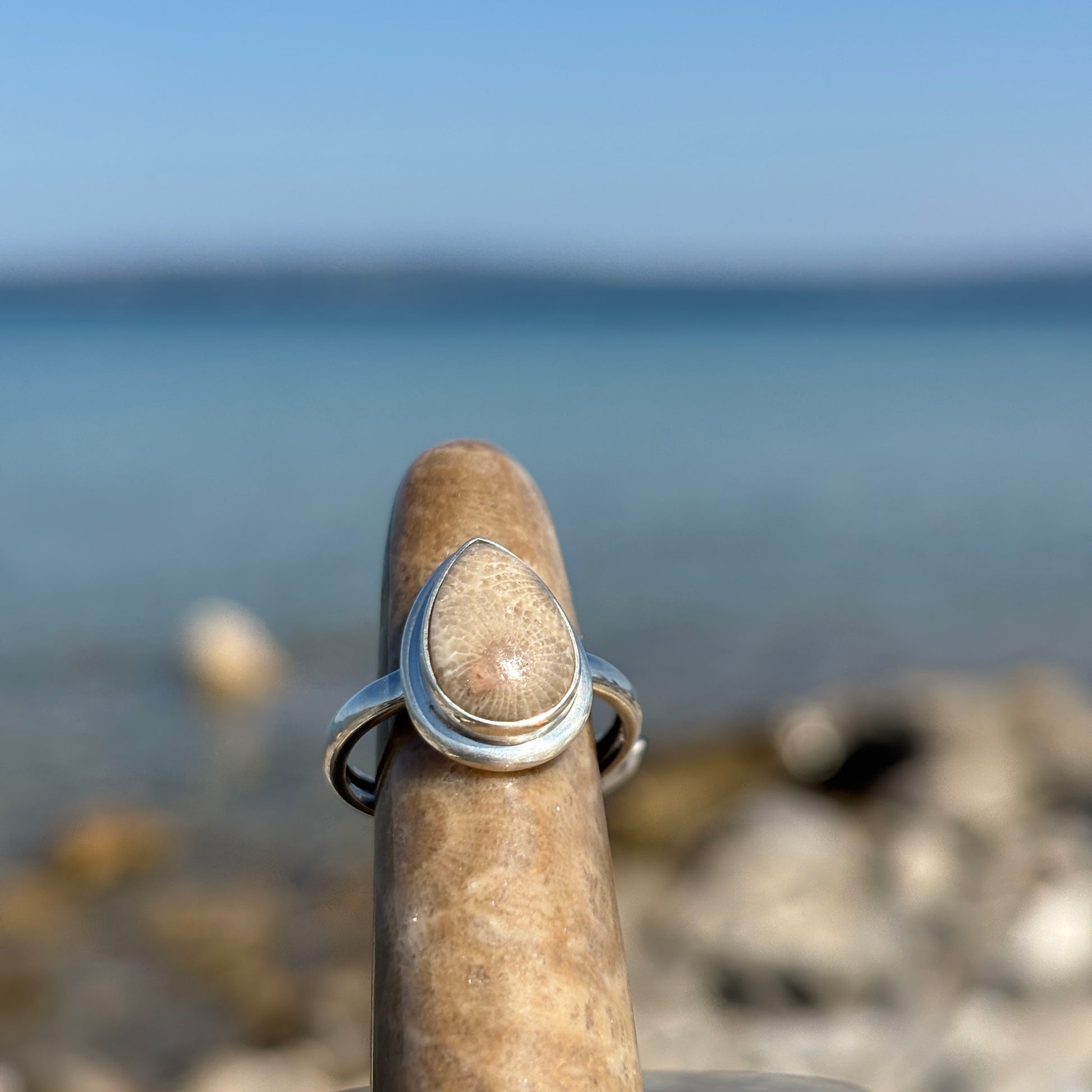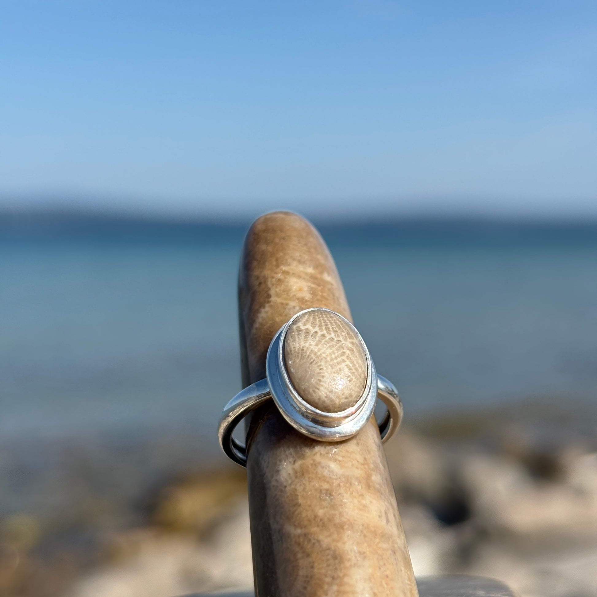 This Petoskey Stone Sterling Silver Ring with Frame beautifully showcases a genuine Petoskey stone set within a sleek sterling silver frame. Each ring highlights the unique fossil pattern of the stone, offering a one-of-a-kind look that connects you to Michigan's natural heritage. Durable and stylish, this ring adds a meaningful touch to everyday wear while making an unforgettable gift for lovers of nature and history. Embrace timeless elegance with a piece that celebrates both earth’s artistry and expert craftsmanship.