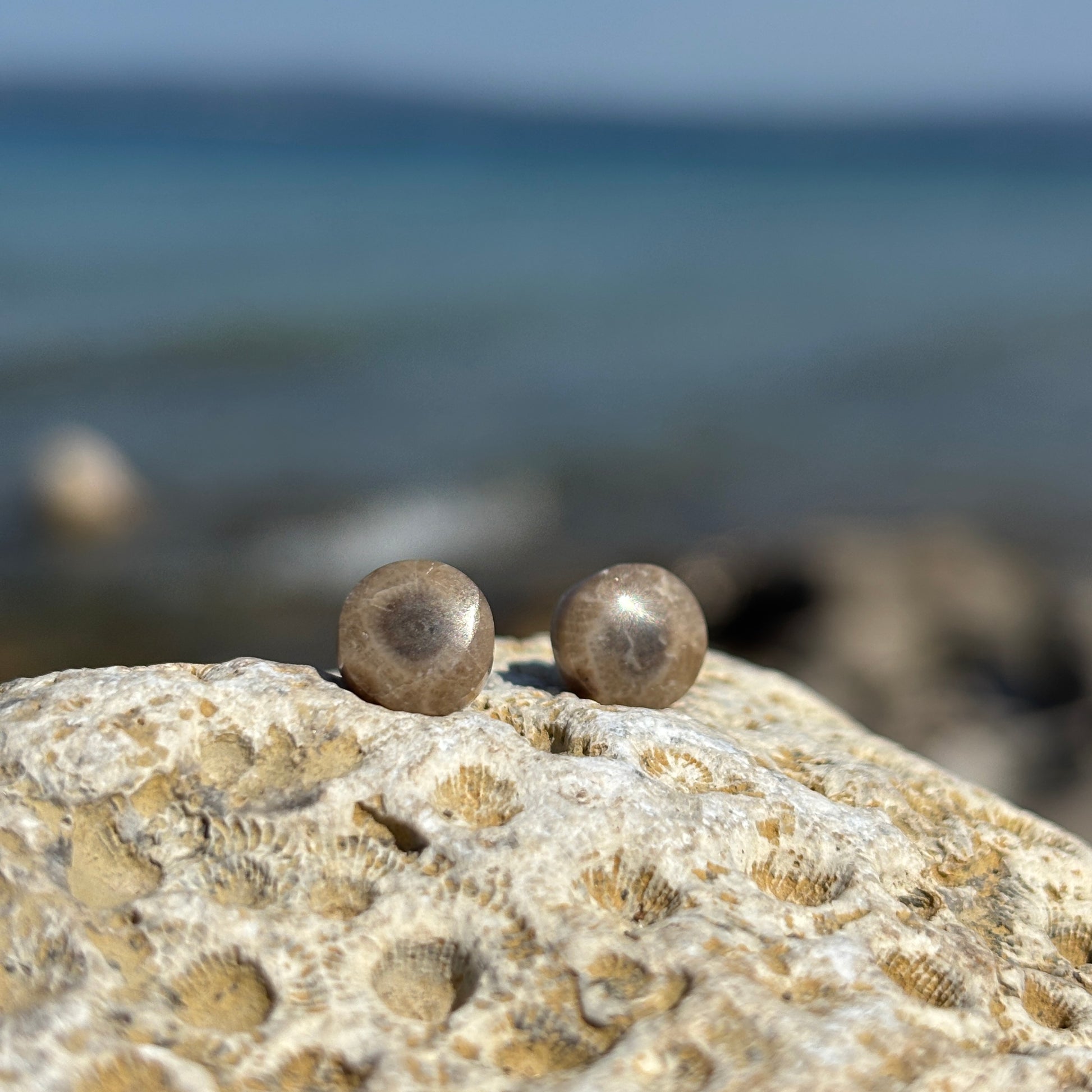 Add a touch of natural charm to your look with these Petoskey Stone Stud Earrings featuring durable steel posts. Each earring showcases a unique slice of Michigan's iconic fossil stone, making every pair one-of-a-kind. These studs offer a playful way to celebrate nature’s art while keeping your style effortlessly cool and comfortable all day long.