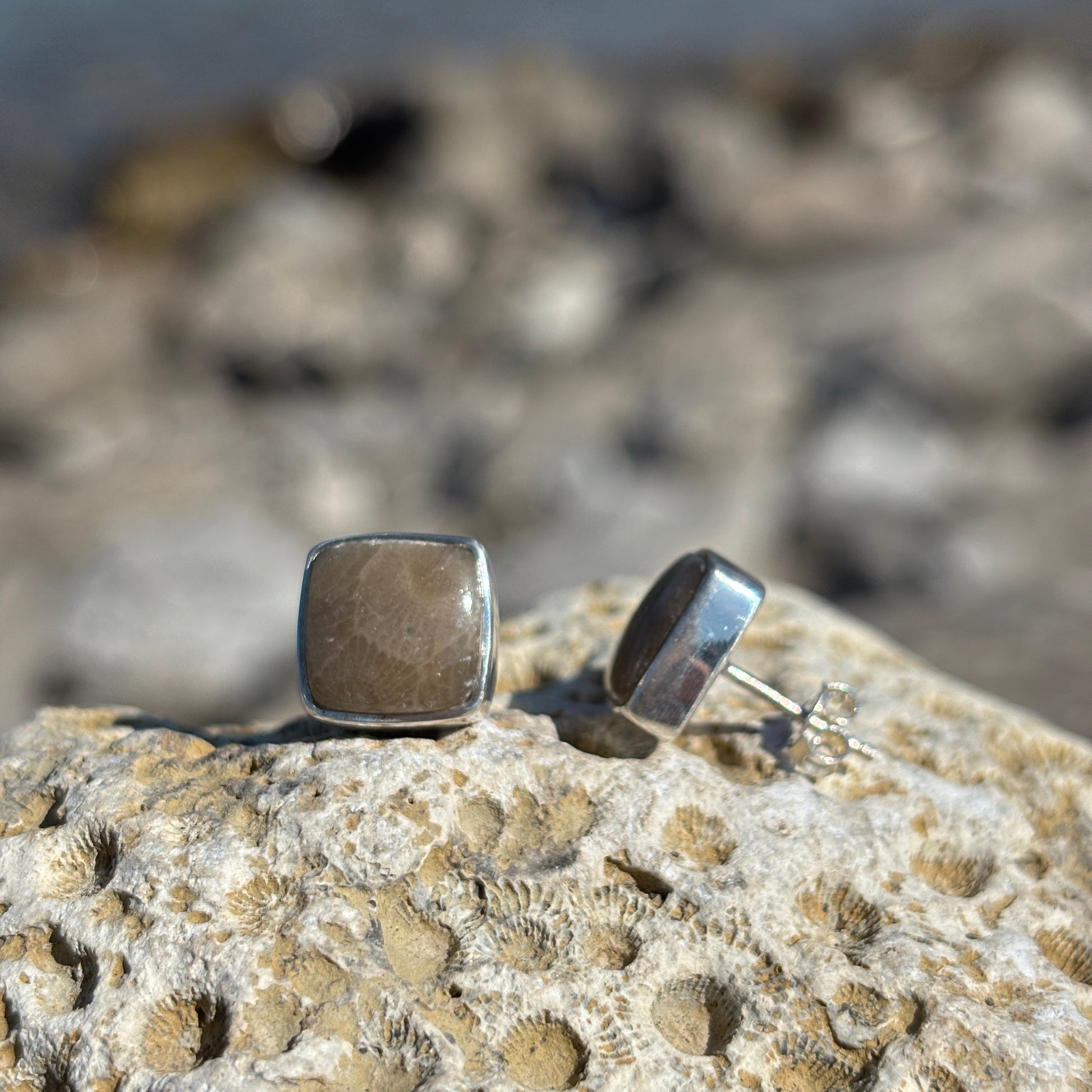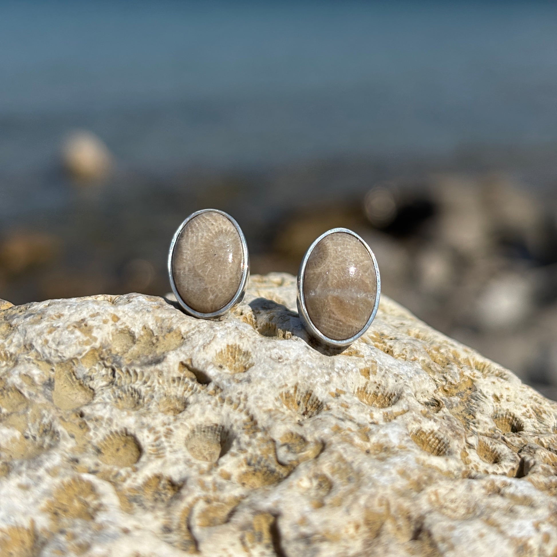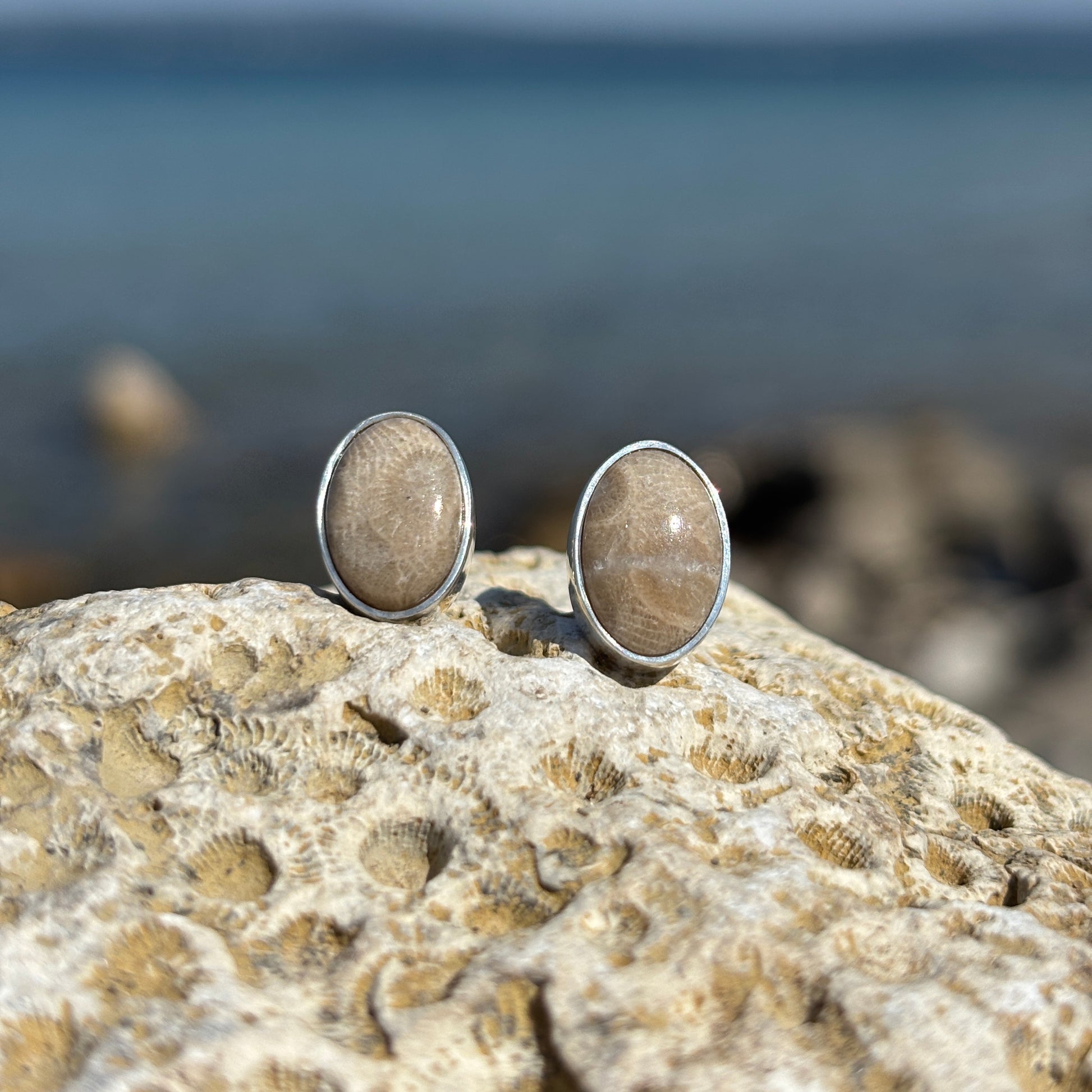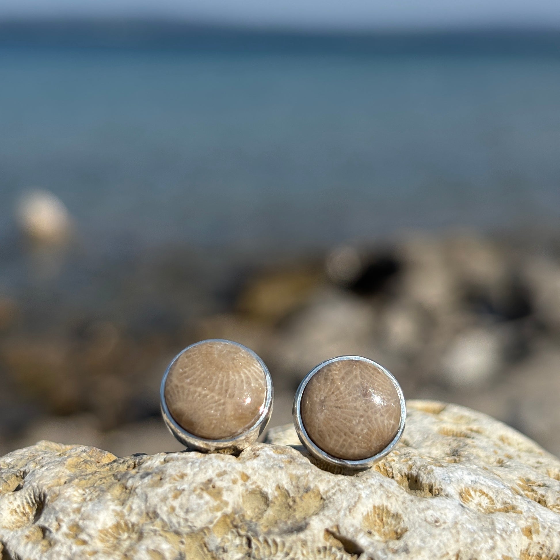 Elevate your elegance with these Petoskey Stone Stud Earrings set in polished sterling silver. Each earring features the natural, distinctive patterns of authentic Petoskey stone, making every pair uniquely captivating. The refined sterling silver setting enhances the stone's subtle beauty, perfectly complementing both casual and formal ensembles with timeless sophistication.